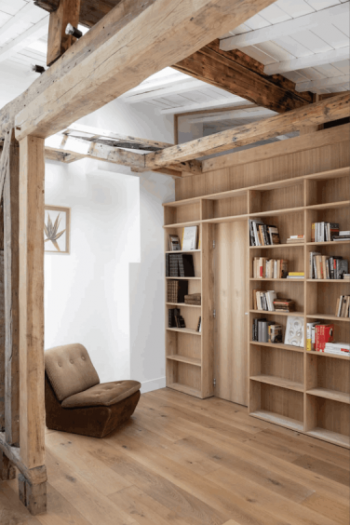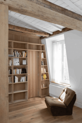 This 40 m2 mini-flat is located in Paris. Originally, it was divided into two very claustrophobic zones, but with the bookstore as the axis of symmetry. The building is supported by a wooden structure dating from 1900, which the architects used as the central element for the renovation.